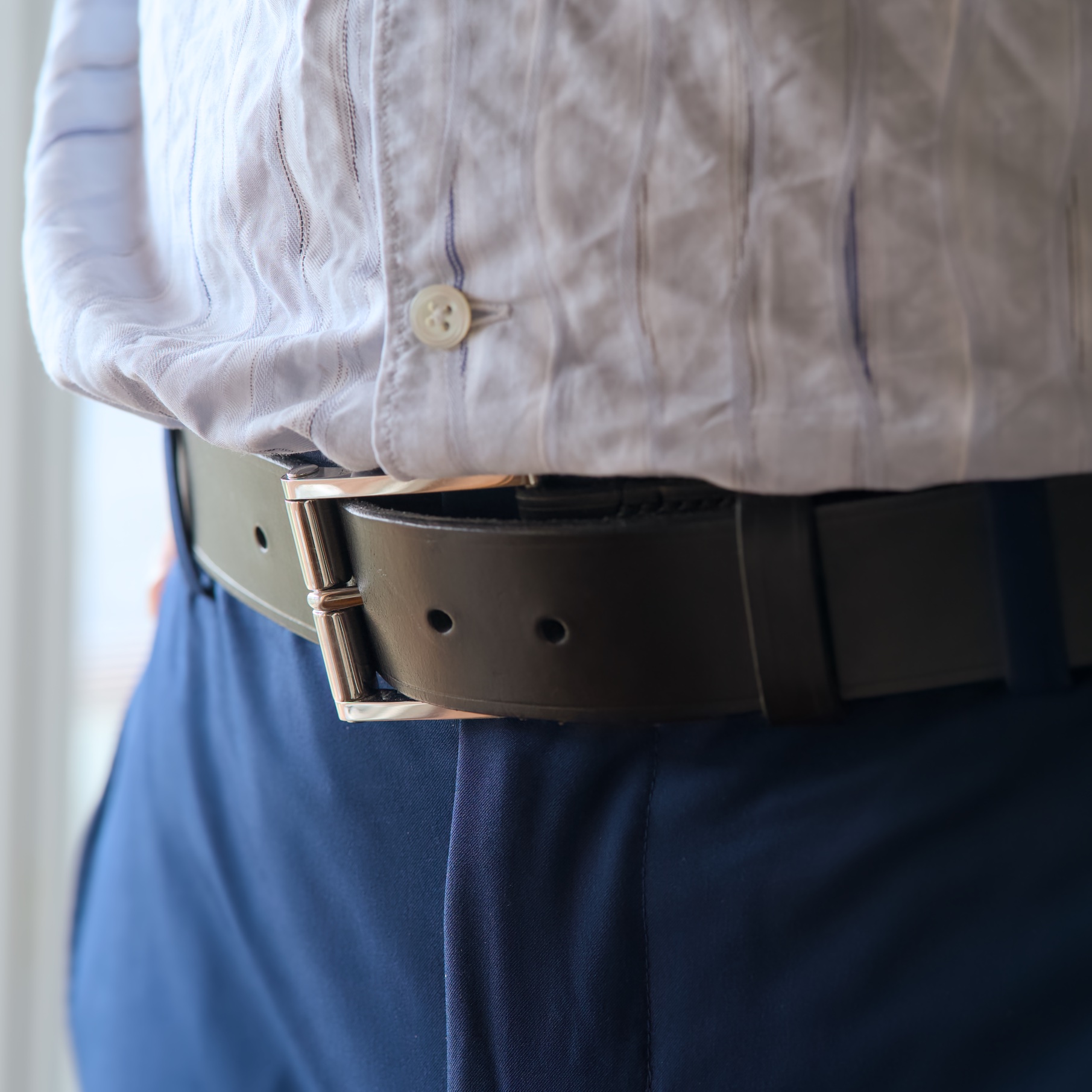 A robust leather belt crafted in a traditional style custom fit to your size. The strap is folded over, with a leather keeper stitched with a single piece of thread into place for strength. The edges are waxed for water repellency and for easily gliding through the keeper.