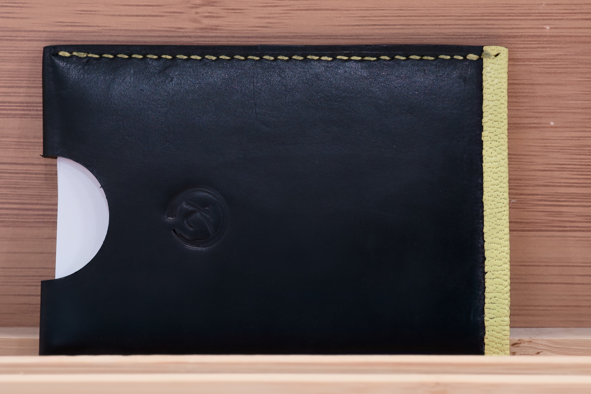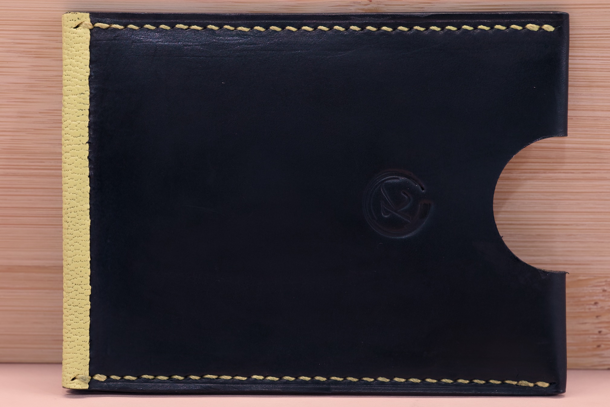 The sample in the photos above are crafted with black calfskin, yellow goatskin, custom ordered yellow Vinymo thread and black edge paint with a Round cut.