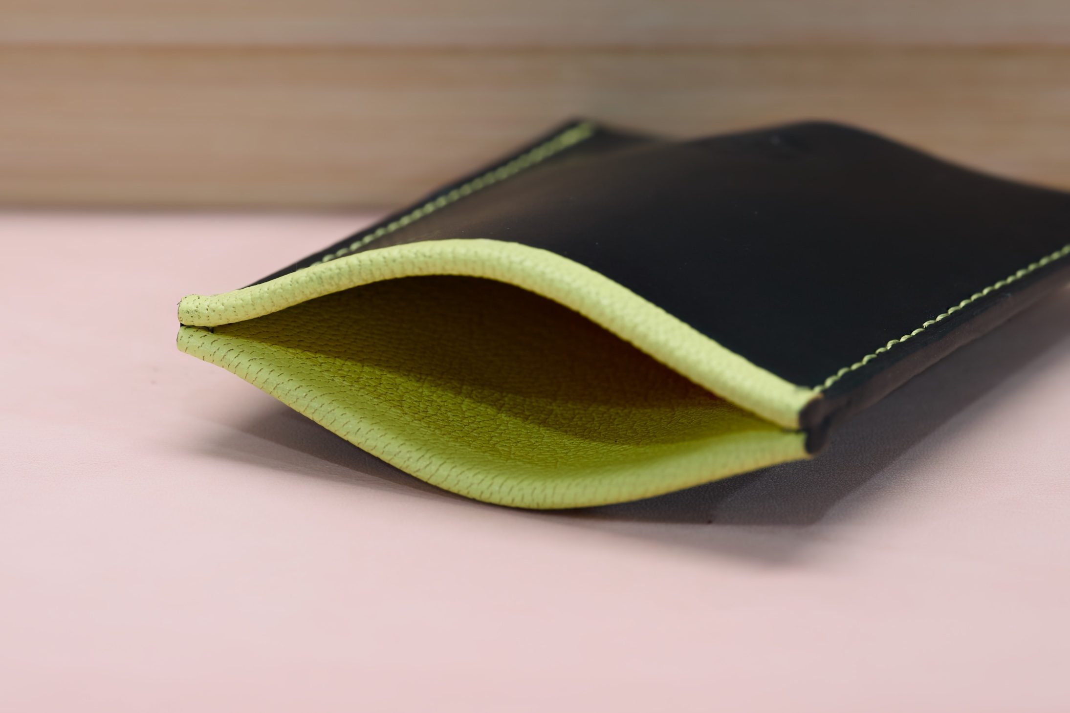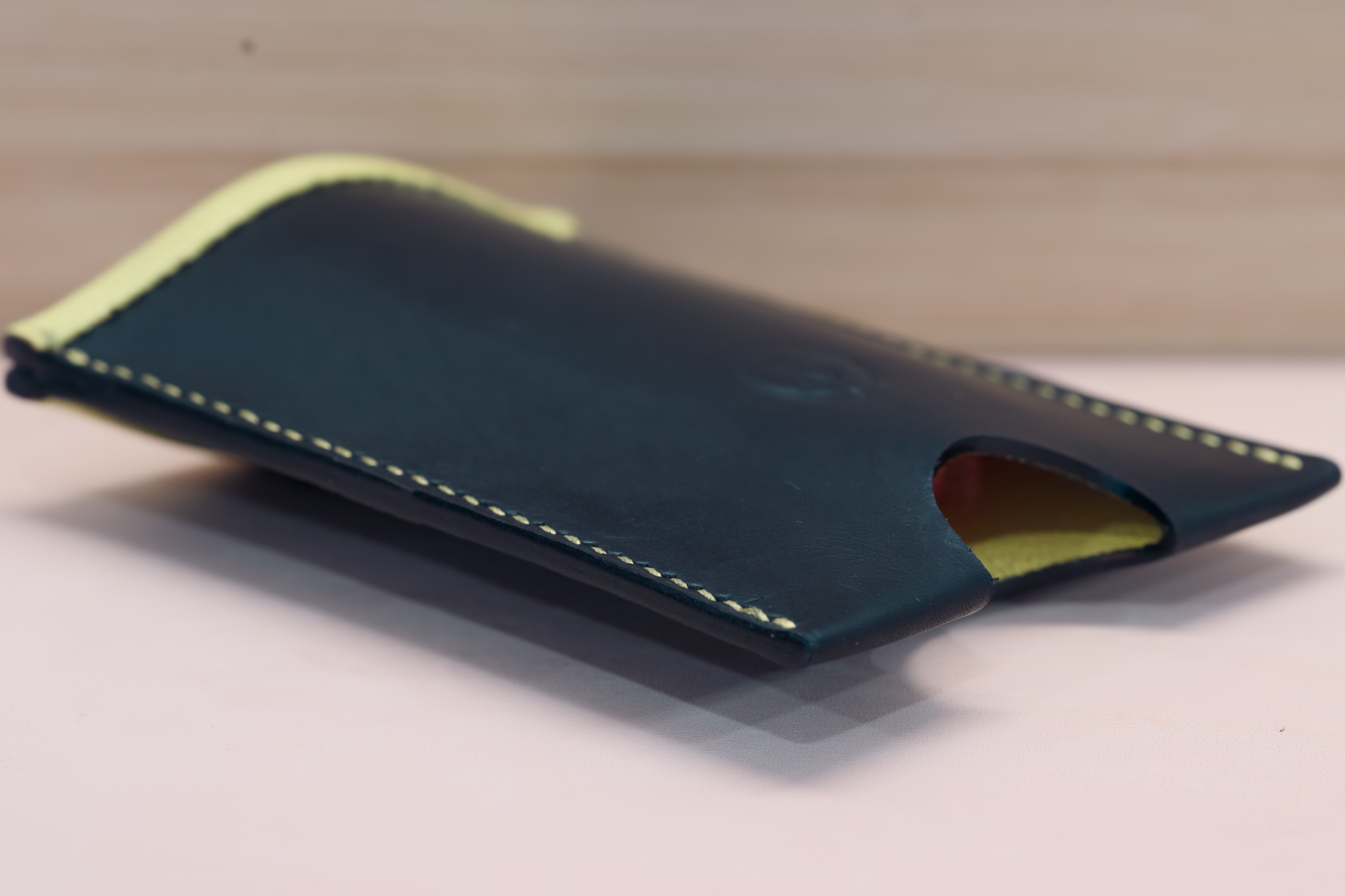 The exterior is a single piece of Italian calf skin, providing a soft and supple feel. The interior is lined with a premium goatskin, incorporating a turned edge at the top for increased durability and a contrasting look on this particular example. The side edges are painted to match the exterior, while the thread choice has been made to match the interior. There is a round cutout at the bottom to allow you to easily push the cards out the top, but you can also choose a different cut out option. See HERE for choices as the reverse of the belt ends can be used to cut out the hole.